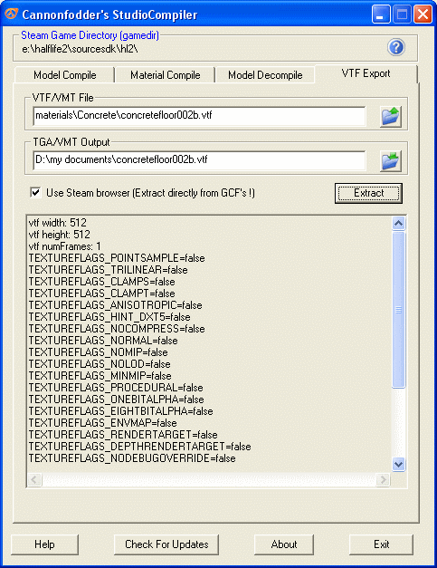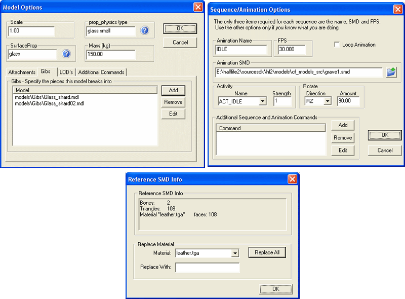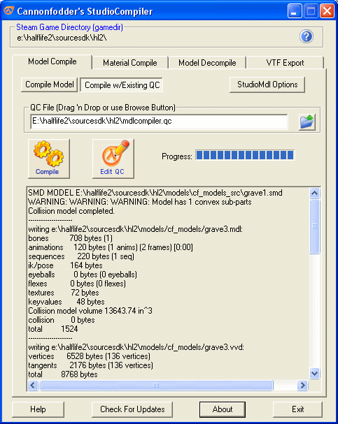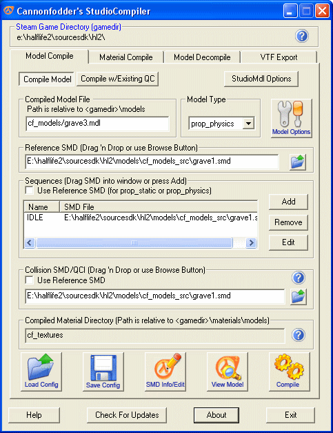 StudioCompiler can compile models either by building a .qc for you for simple models or compile using an existing qc file. It can provide info on the reference SMD file and allows the user to replace its materials (For all you who forgot to texture the model before export, or if you want to use the same SMD's, but use a new texture).